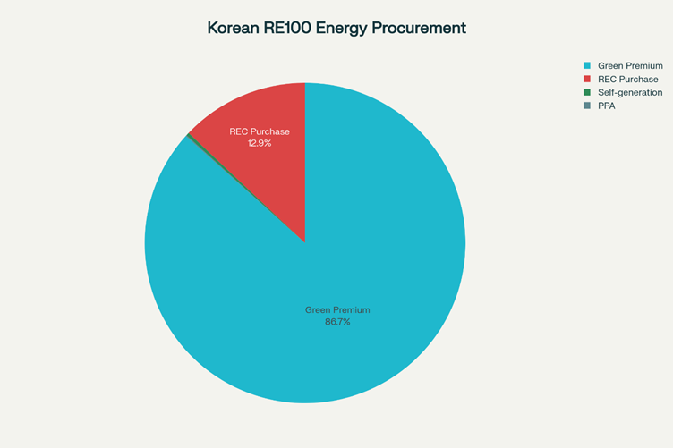 국내 RE100 기업들은 녹색프리미엄 87%, REC 구매 13%, 자가발전 0.3%, PPA 0.1% 순으로 재생에너지를 조달하고 있습니다. 이는 글로벌 평균(REC 구매 41%, PPA 31%, 녹색요금제 24%)과는 매우 다른 양상입니다.